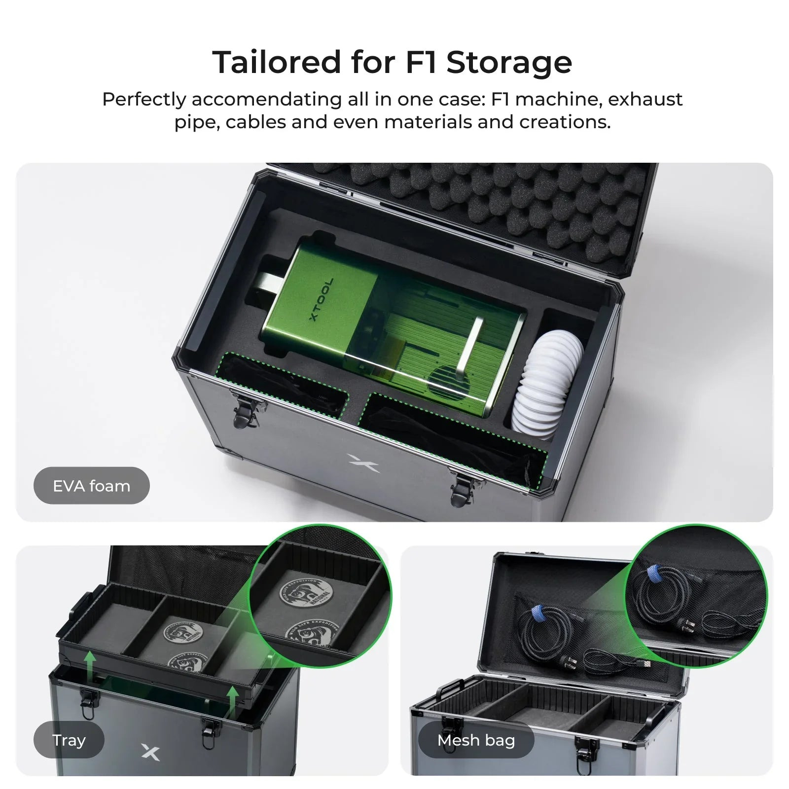 The xTool F1 Rolling Hard Case is a durable and portable storage solution designed to protect and transport your xTool F1 or F1 Lite laser engraver. Constructed with a rugged shell made of aluminum and wood, it resists shock and impact, while the precisely embedded EVA foam interior ensures stability during travel. Tailored slots securely hold the F1 device, with additional compartments for accessories, storage bags, and a special tray for materials or creations.